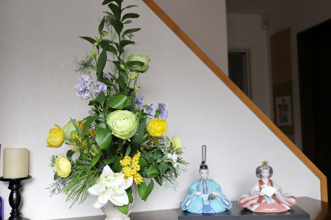 フラワーアレンジメントでお雛祭りをめでる