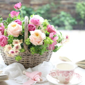 白いバスケットが花々の色を引き立て、軽やかでナチュラルな印象を演出しています。
