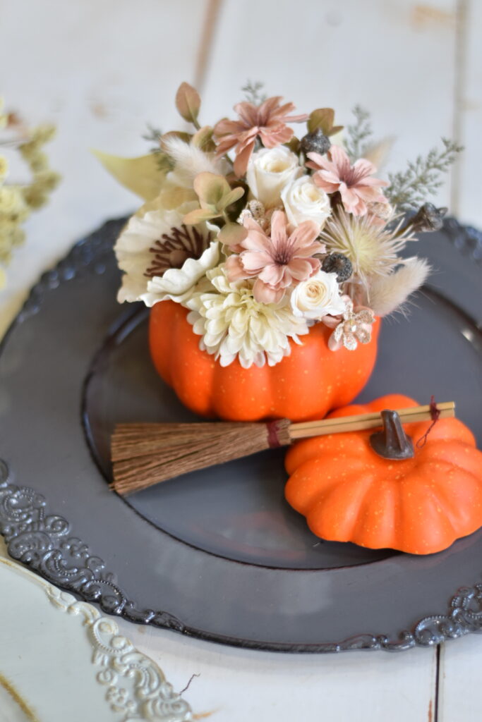 かぼちゃは見た目のインパクトだけでなく、花材と組み合わせることで空間全体を一気にハロウィンらしい雰囲気に変えてくれます。