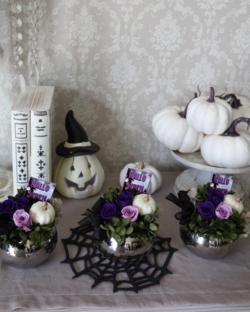 生花と比べると色味が落ち着いており、全体的にシックな印象になるため、ハロウィンの大人っぽい演出にはぴったりです。