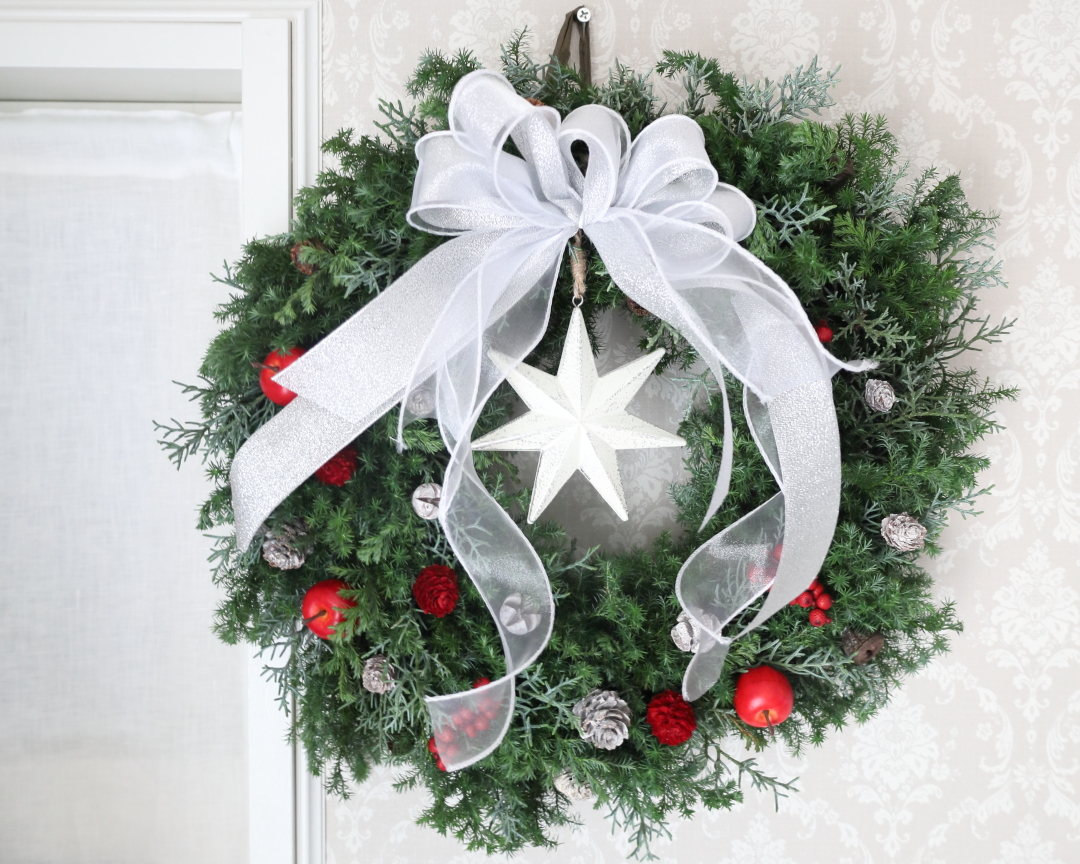 華やかに見せたいときは、ベルベットの赤いリボンを中央にあしらうとクリスマスらしい雰囲気になります。